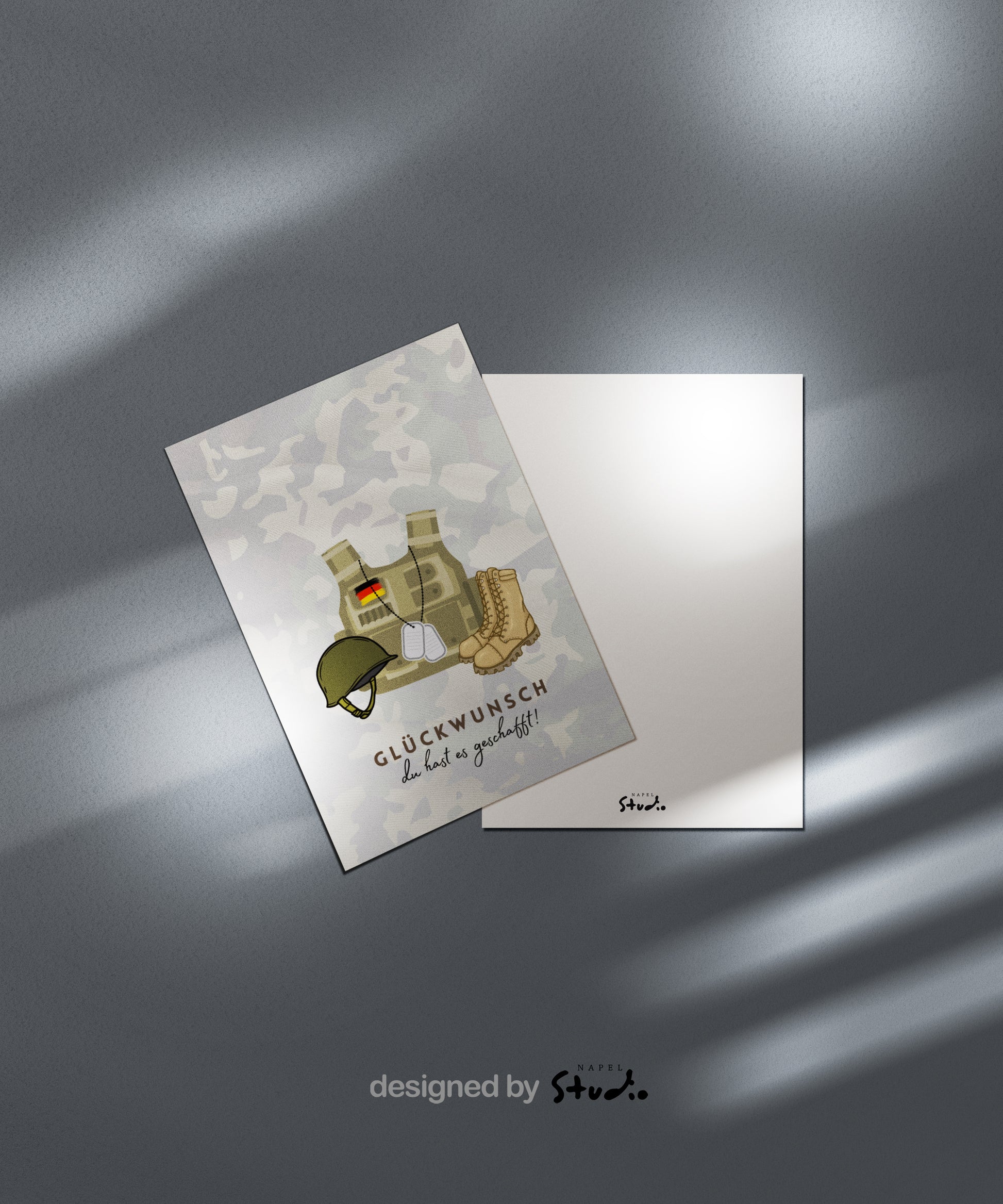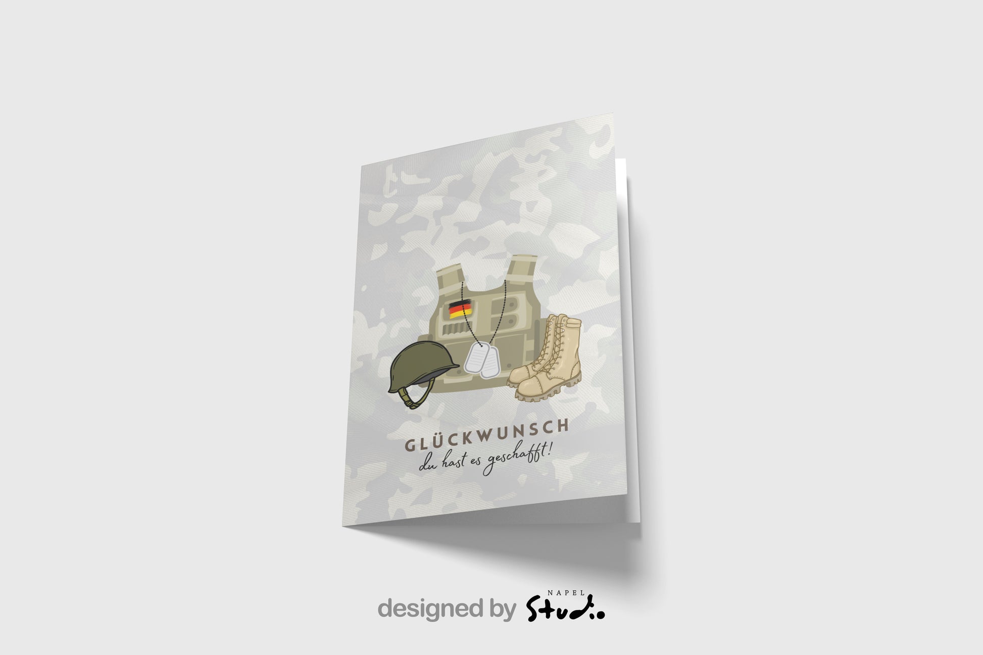 Diese stilvolle A6-Glückwunschkarte mit taktischer Weste, Helm, Stiefeln und Erkennungsmarken ist das perfekte Geschenk für frisch ausgebildete Soldaten oder Soldatinnen.