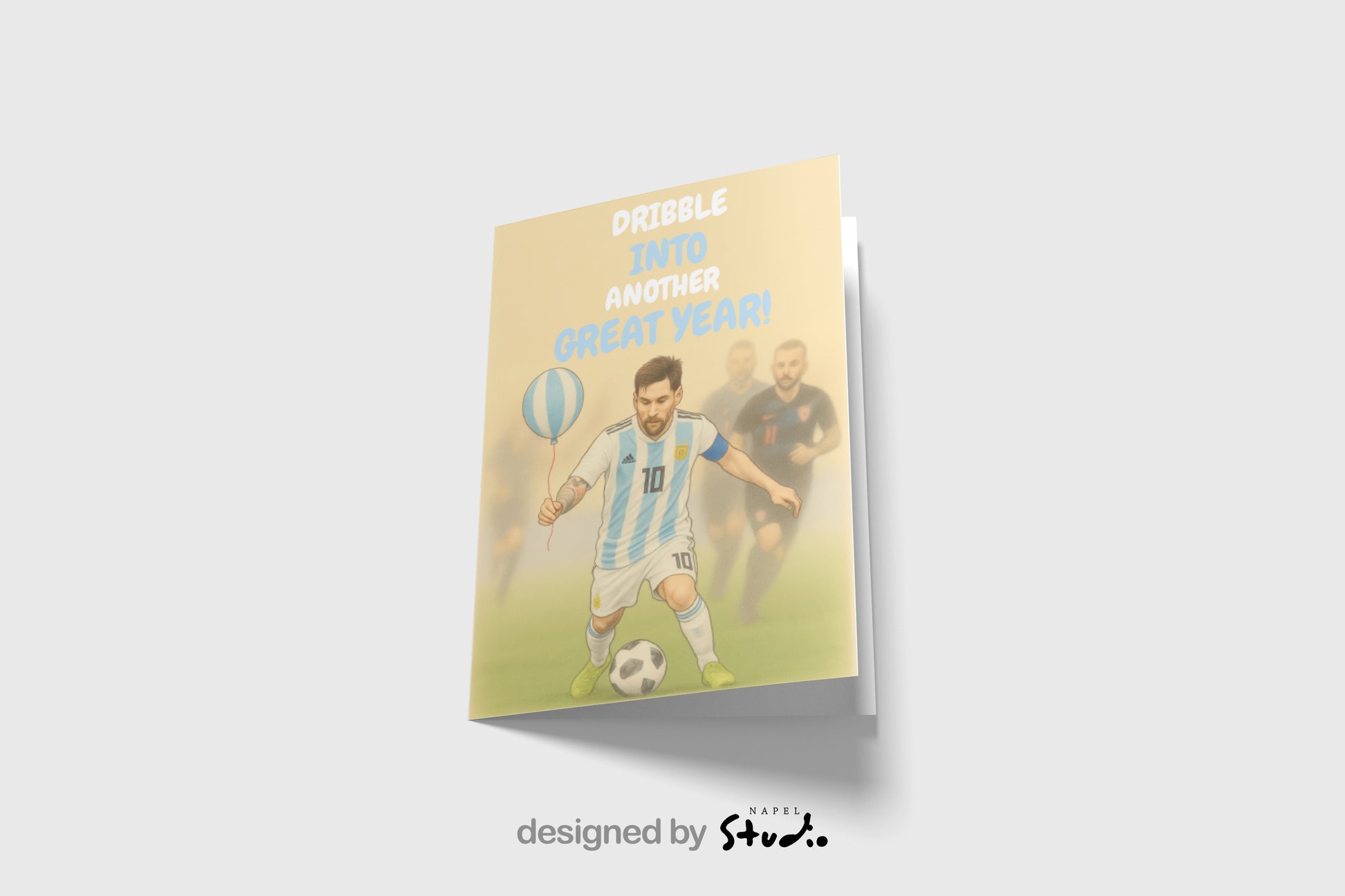 Das Motiv zeigt Lionel Messi im argentinischen Trikot mit Ballon und dem Text „Dribble into another great year!“ – perfekt als Geburtstagskarte für Kinder, Jugendliche oder Erwachsene, die Fußball lieben.