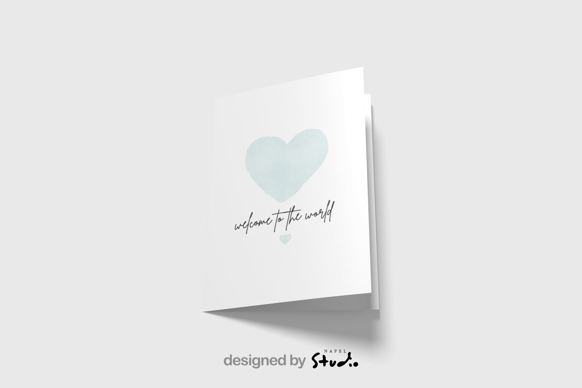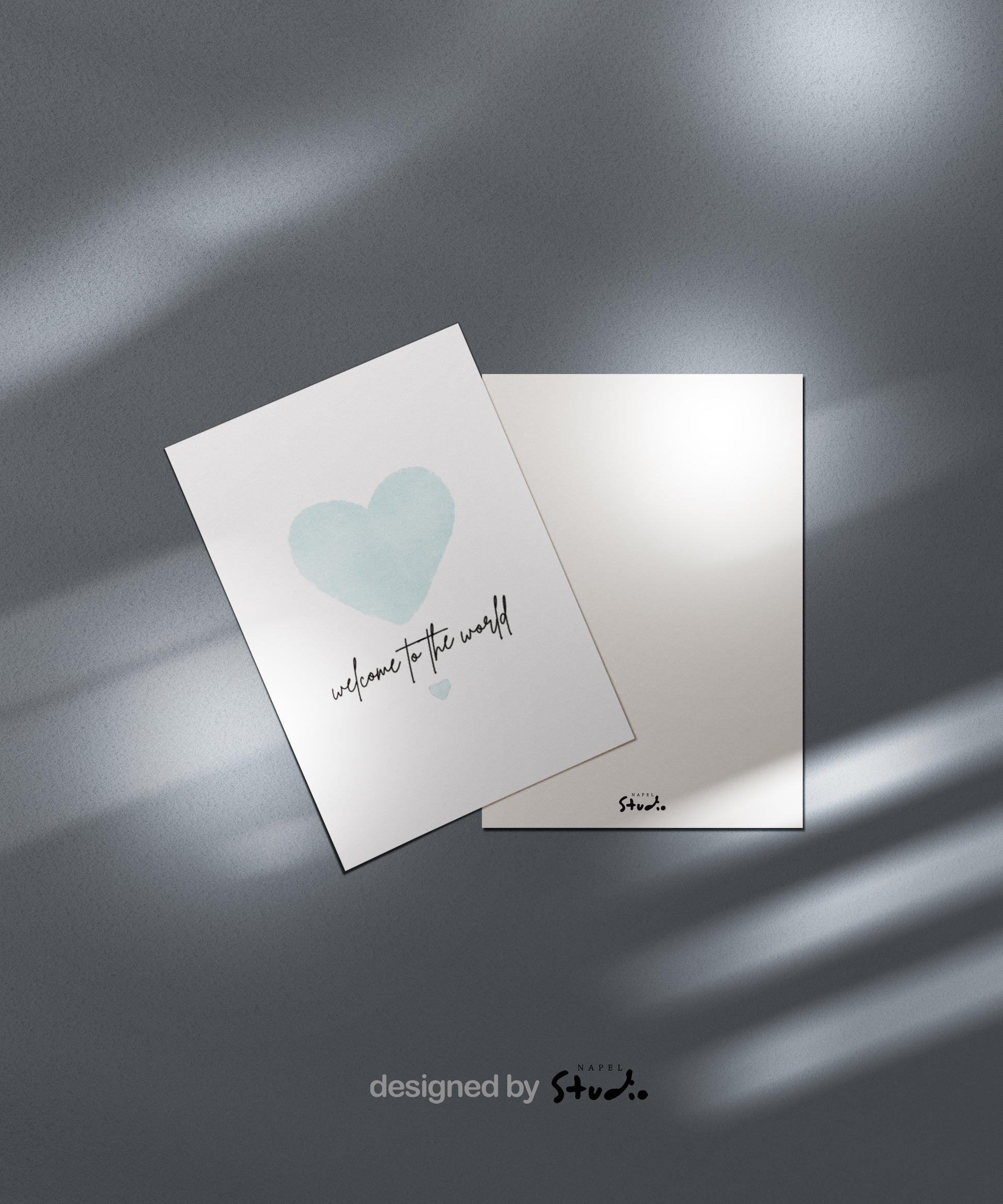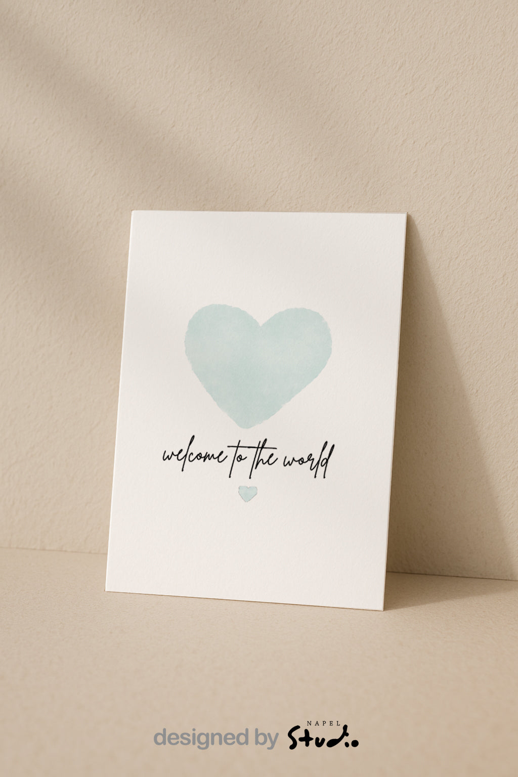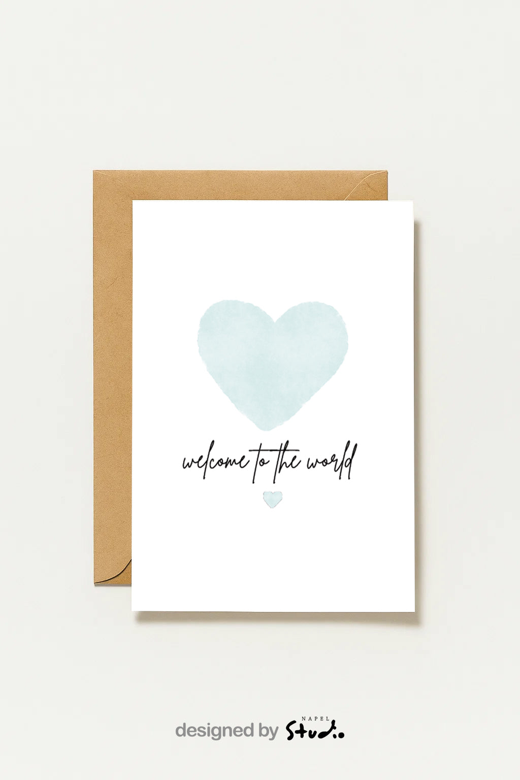 Diese zarte A6-Geburtskarte mit pastellblauem Herz und dem Schriftzug „Welcome to the World“ ist die perfekte Art, Glückwünsche zur Geburt auszudrücken.