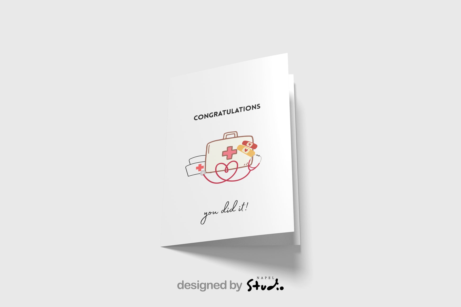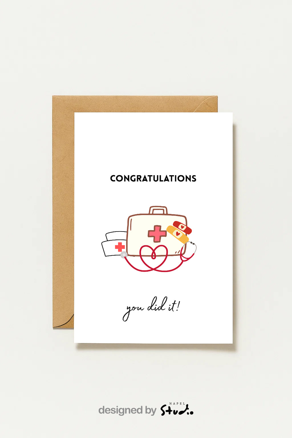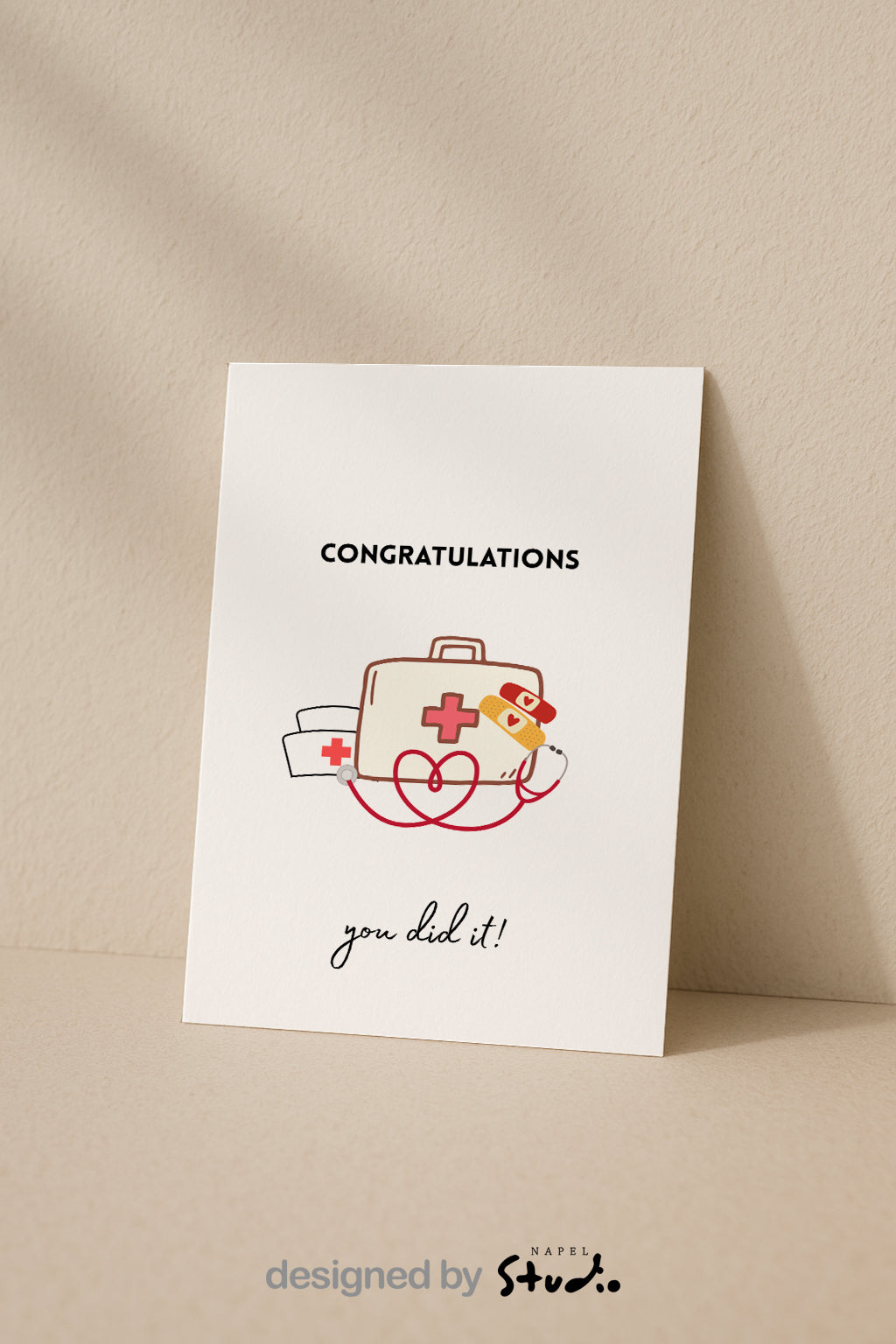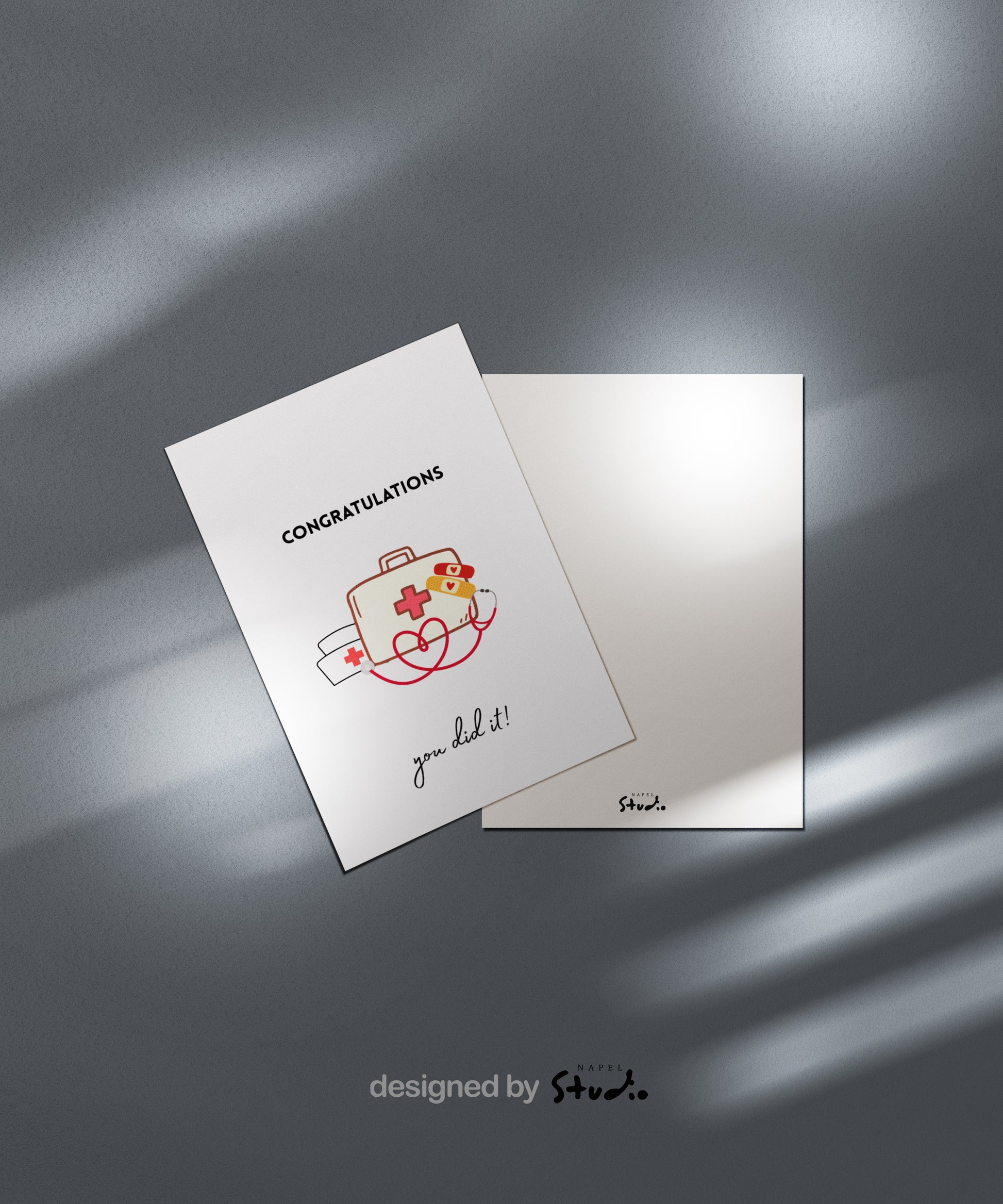 Diese liebevoll gestaltete A6-Karte mit Arzttasche, Pflastern, Stethoskop in Herzform und dem Text „Congratulations, you did it!“ ist ideal für frisch examinierte Krankenschwestern, Ärzte oder Pflegekräfte.
