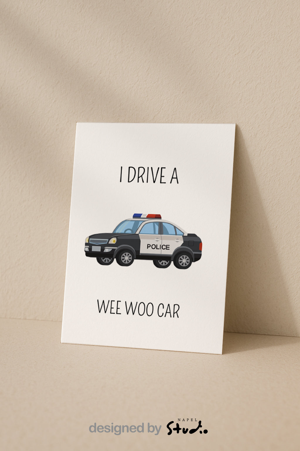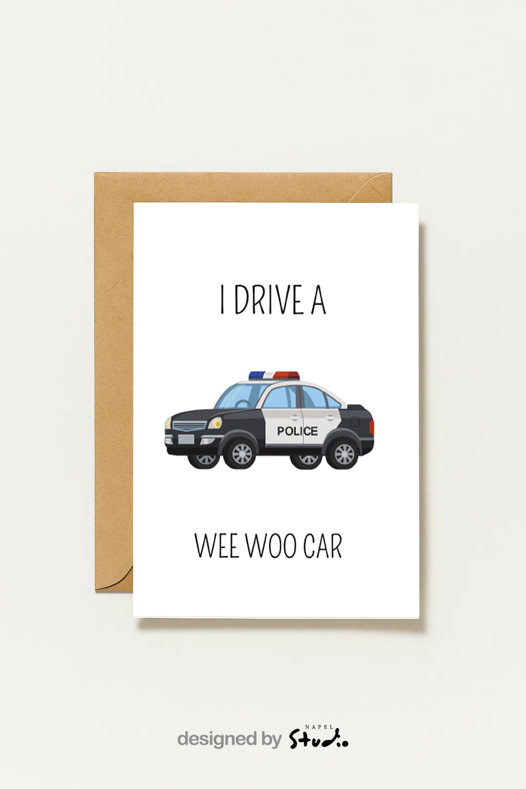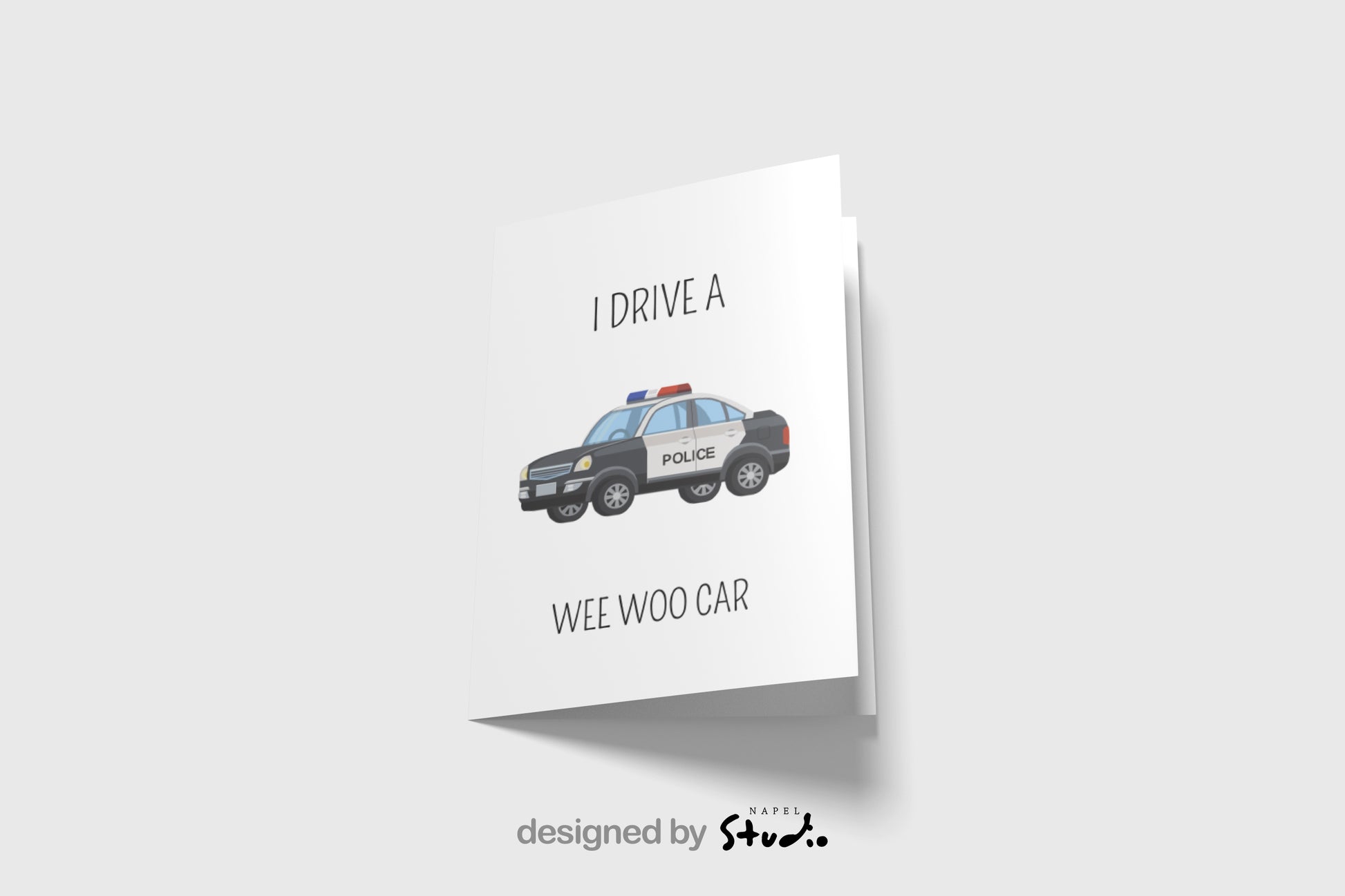 Diese witzige A6-Karte mit Polizeiauto-Illustration und dem Spruch „I Drive a Wee Woo Car“ ist perfekt für Polizisten, Polizei-Fans oder einfach als Spaßkarte.
