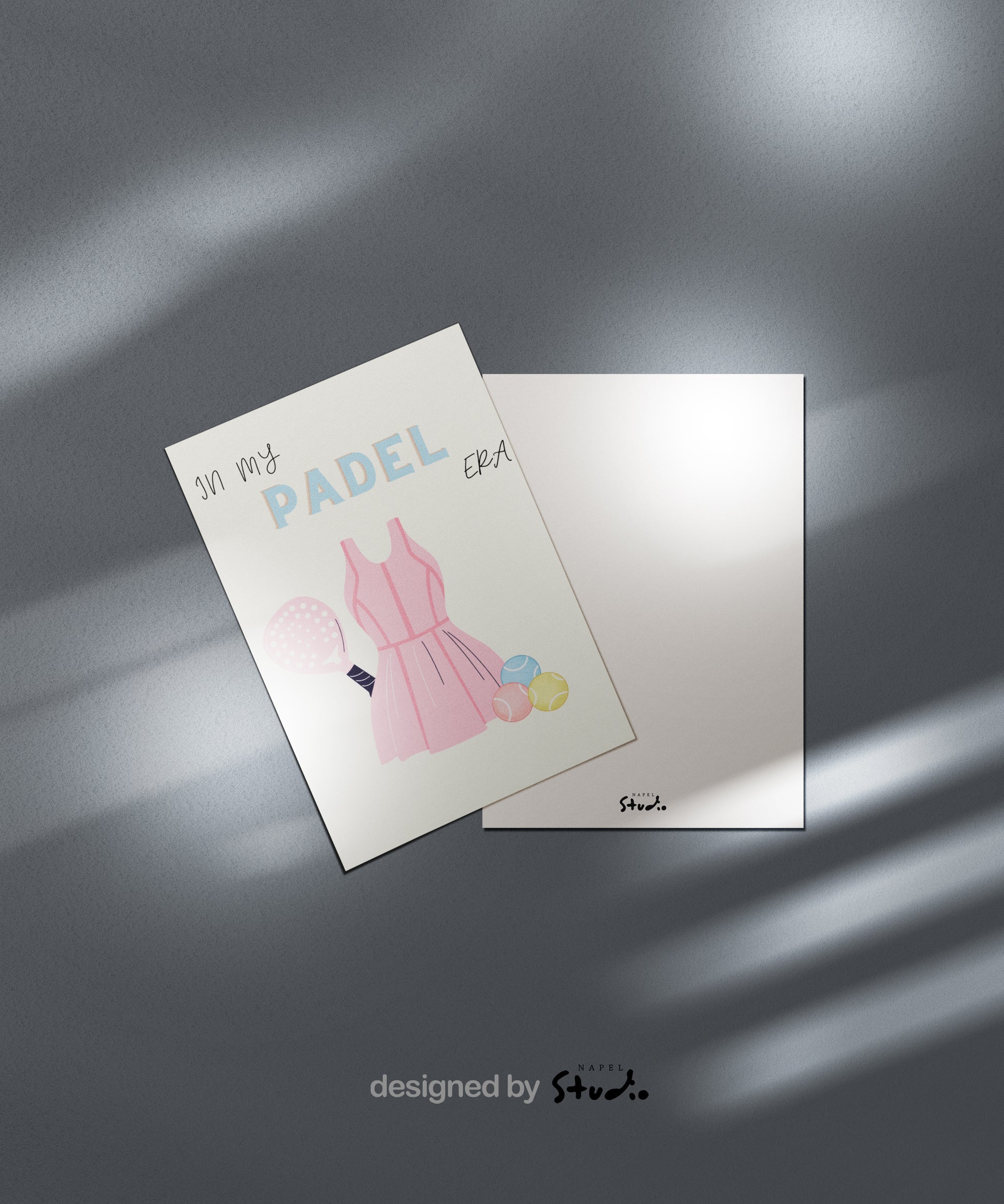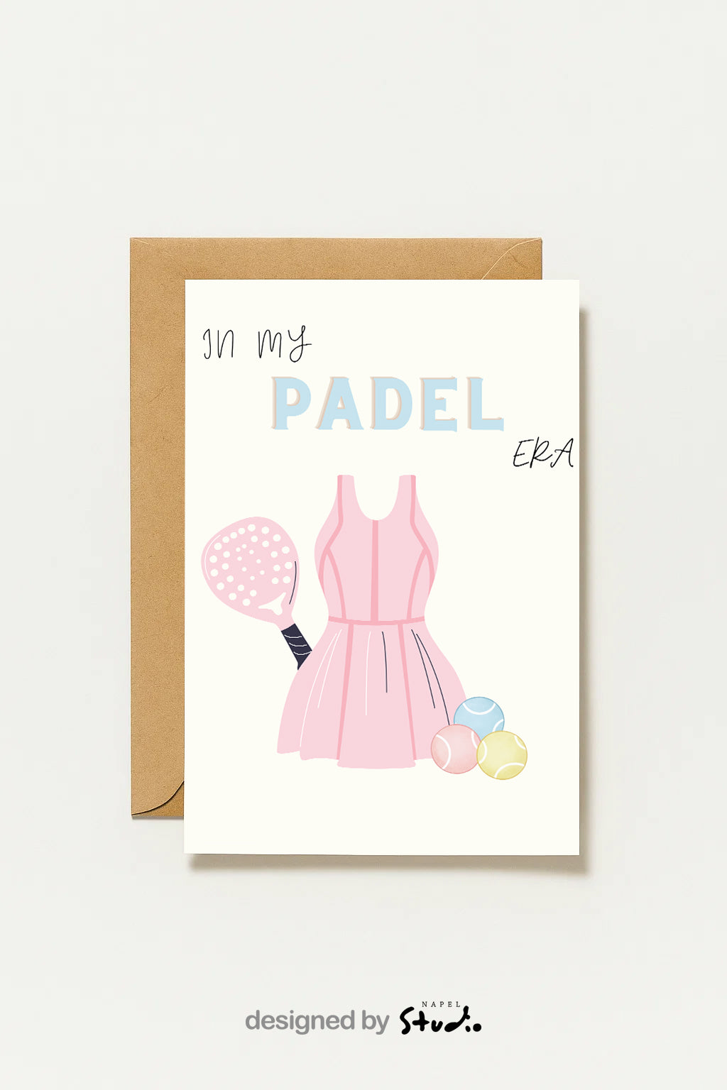 Diese stilvolle Karte im Boho-Design zeigt den Spruch „In my Padel Era“ mit pinkem Kleid, Padel-Schläger und bunten Bällen 🎾.