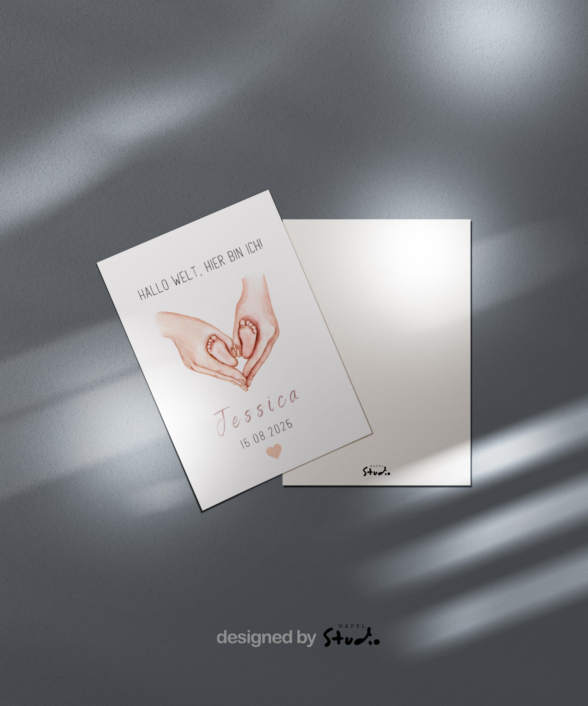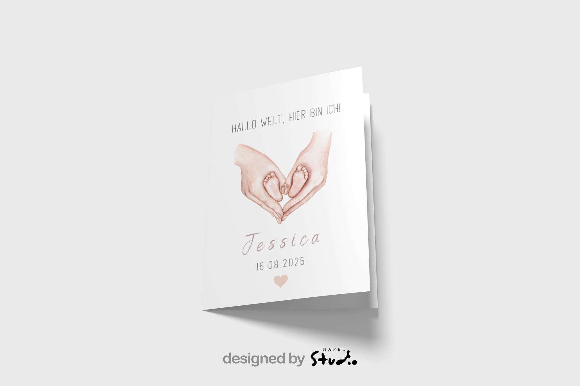 Ein zartes Motiv mit Babyfüßchen in Herzform gehalten von Händen macht diese Karte zu etwas ganz Besonderem.