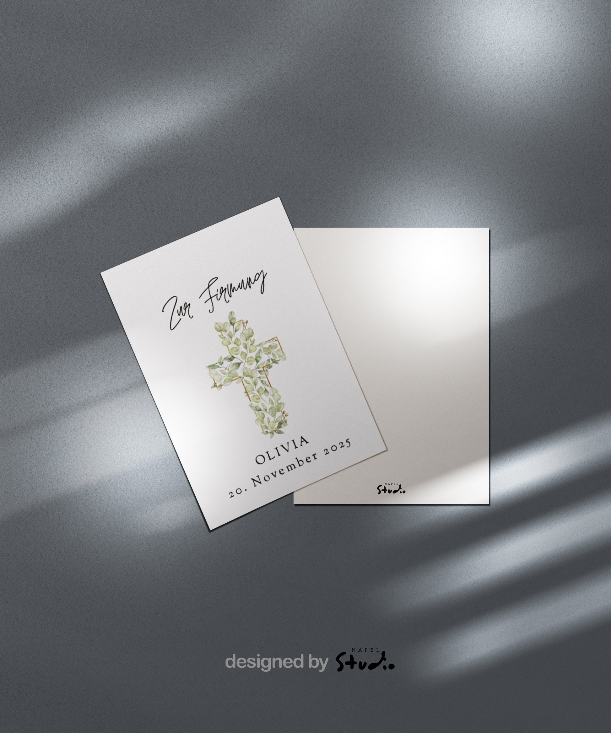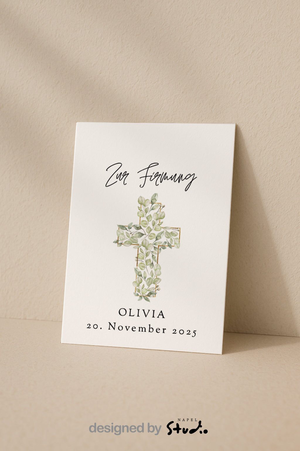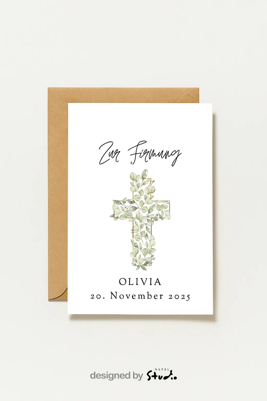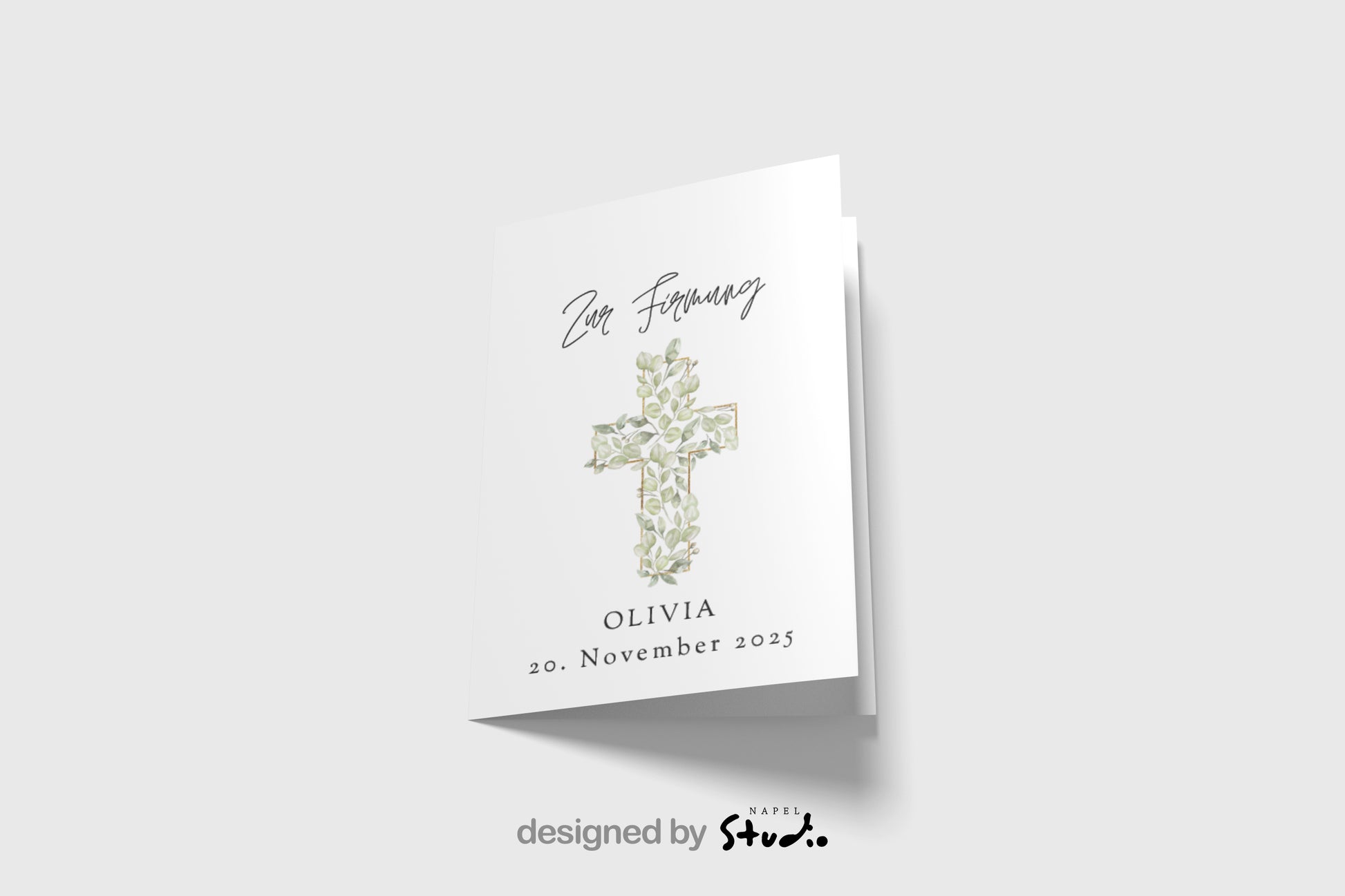 Diese liebevoll gestaltete Karte zur Firmung ist ein echter Hingucker 💌. Das edle Kreuz mit zarten Blättern 🌿 und goldenen Akzenten wirkt modern und feierlich zugleich.